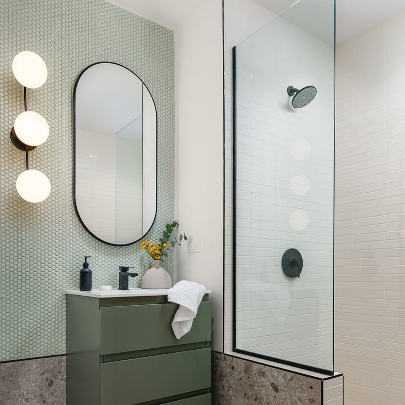 - Japanese fern green and white penny tiling throughout vanity walls, showers and baths